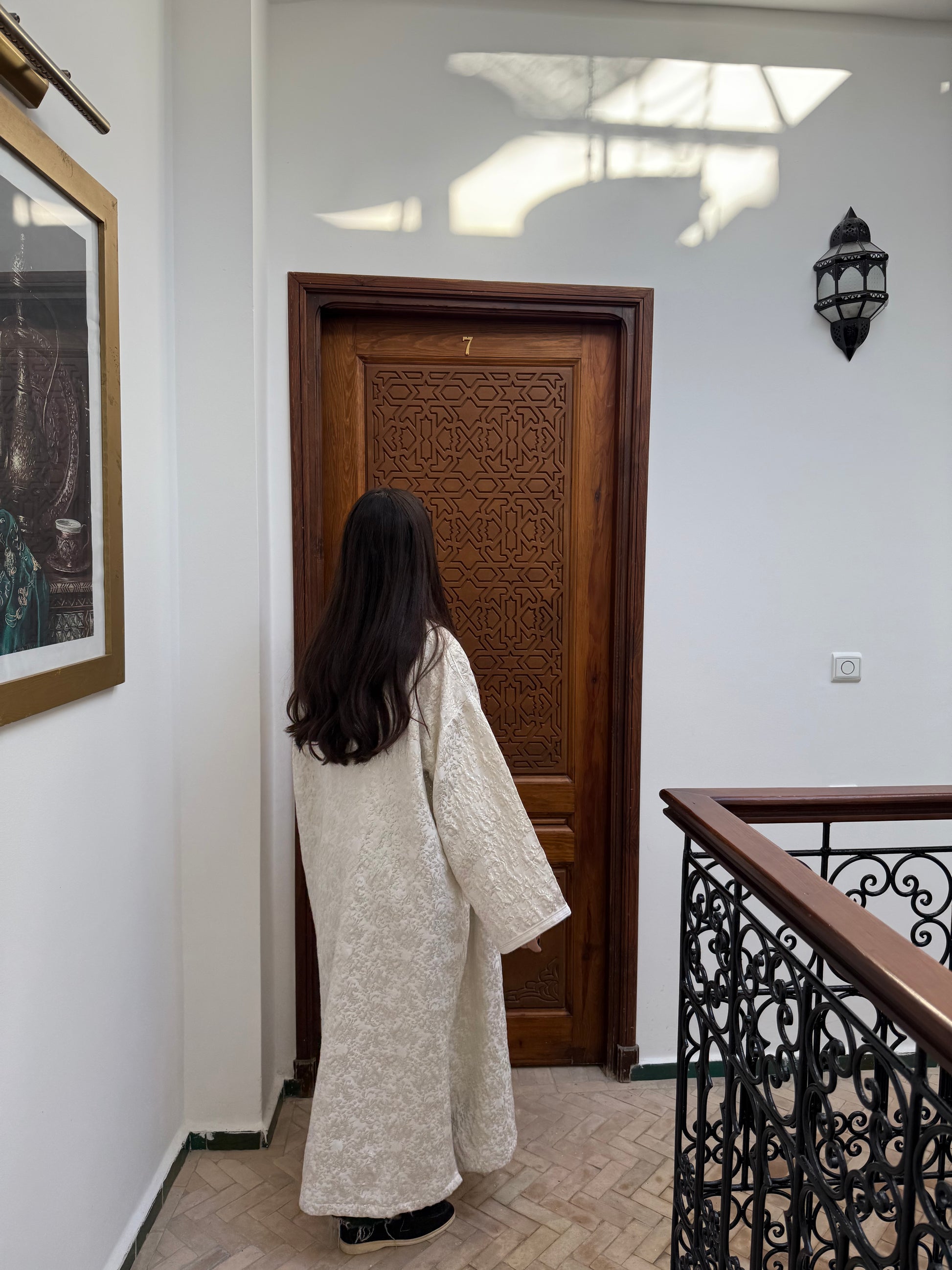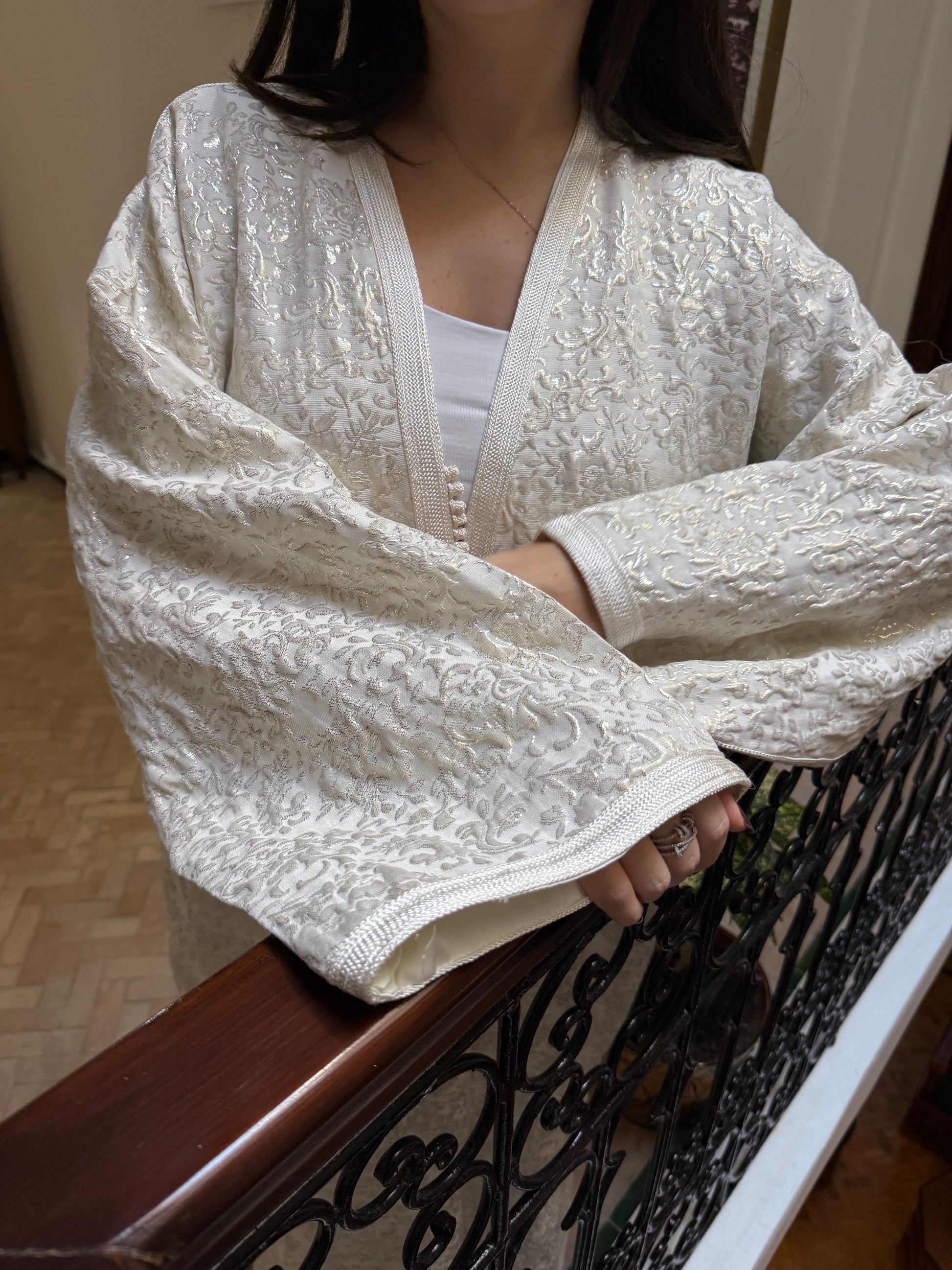 Handmade and tailored, this traditional garment features a timeless silhouette and delicate details. From the embroidered accents to the elegant lines, every element of this piece is a testament to the artistry and richness of Moroccan heritage. Baya branded label.
